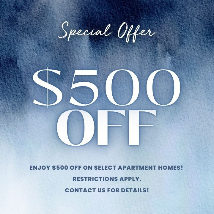 Enjoy a $500 Move-In Discount on Select Apartment Homes! Restrictions Apply. Contact Us for Details!